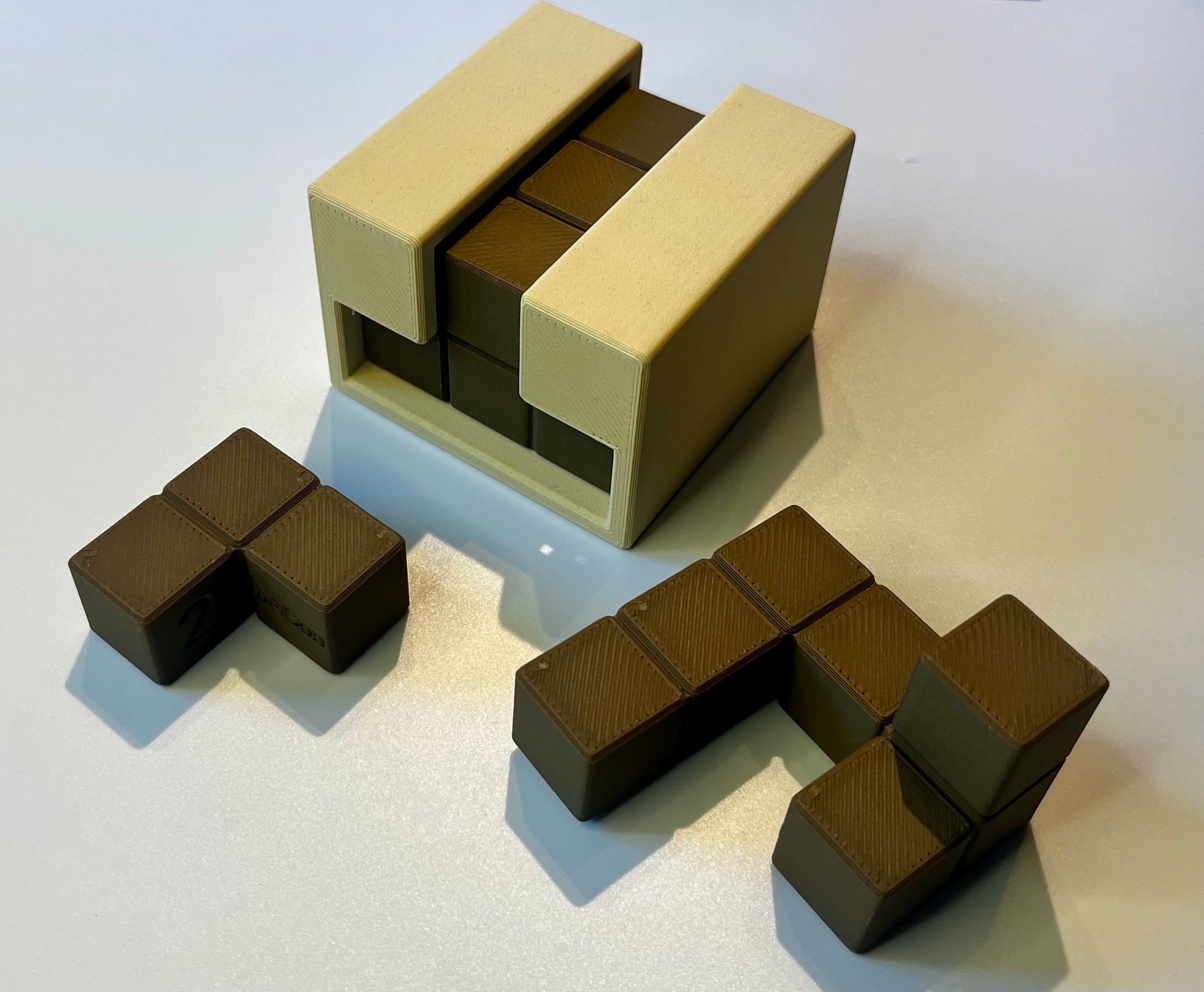 This puzzle is 3D printed using premium wood infused filaments and a multicolor printing approach. The resulting puzzle has an exceptional look and feel. The puzzle is also a bit larger and much stronger than my normal prints