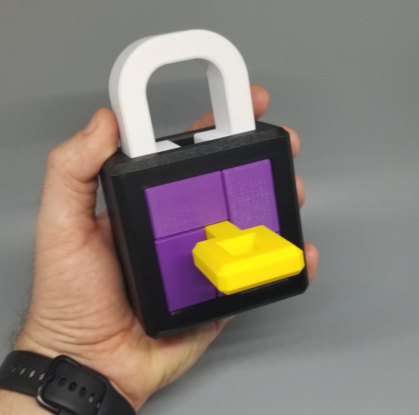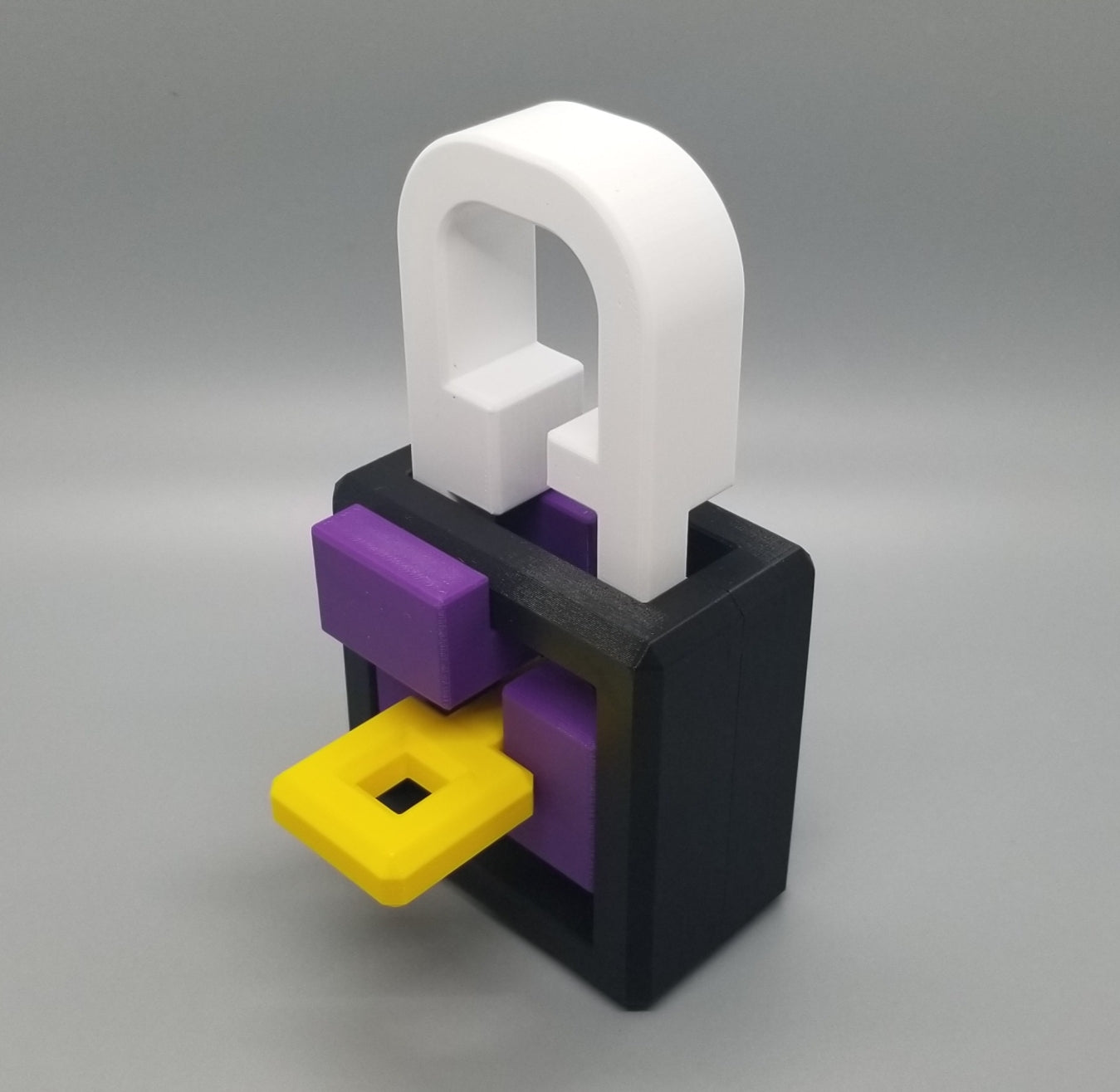 A burr puzzle with the appearance of a padlock. The main challenge is having the key installed vertically, and to disassemble as well as re-assemble the puzzle. Burrtools level 26. If the key is installed horizontally then Burrtools finds the same level, however, this side challenge shows a rotational shortcut after the 11th move. For the main challenge no rotational shortcut was yet found.
