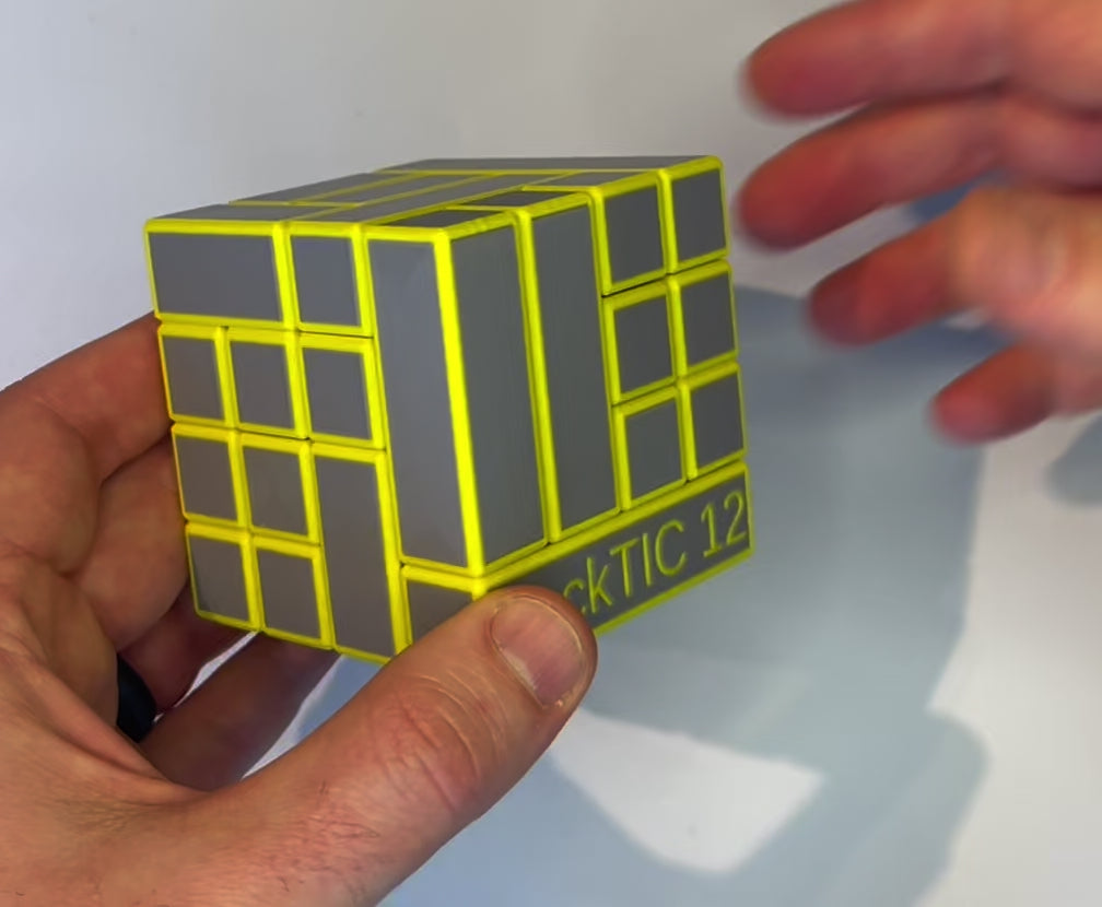 PackTIC 12 (Packing Turning Interlocking Cube 12) is fantastic combination of a packing and interlocking cube puzzle which requires sliding moves and rotations to solve - This is a 3D printed cube puzzle using premium filaments and a multicolor approach. The resulting puzzle has an exceptional look and feel. The puzzle is also a bit larger and much stronger than my normal prints; using a new longer and stronger "dowel" style approach for the joints. Standard puzzle hamster shown for size :-).